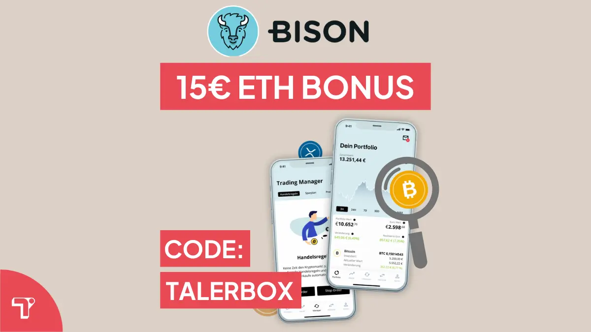 Mit dem Aktionscode “Talerbox” kannst du dir 20 € in Ethereum bei der Anmeldung und Registrierung in der Bison App sichern. Nutze dazu einfach unseren Bison Link.