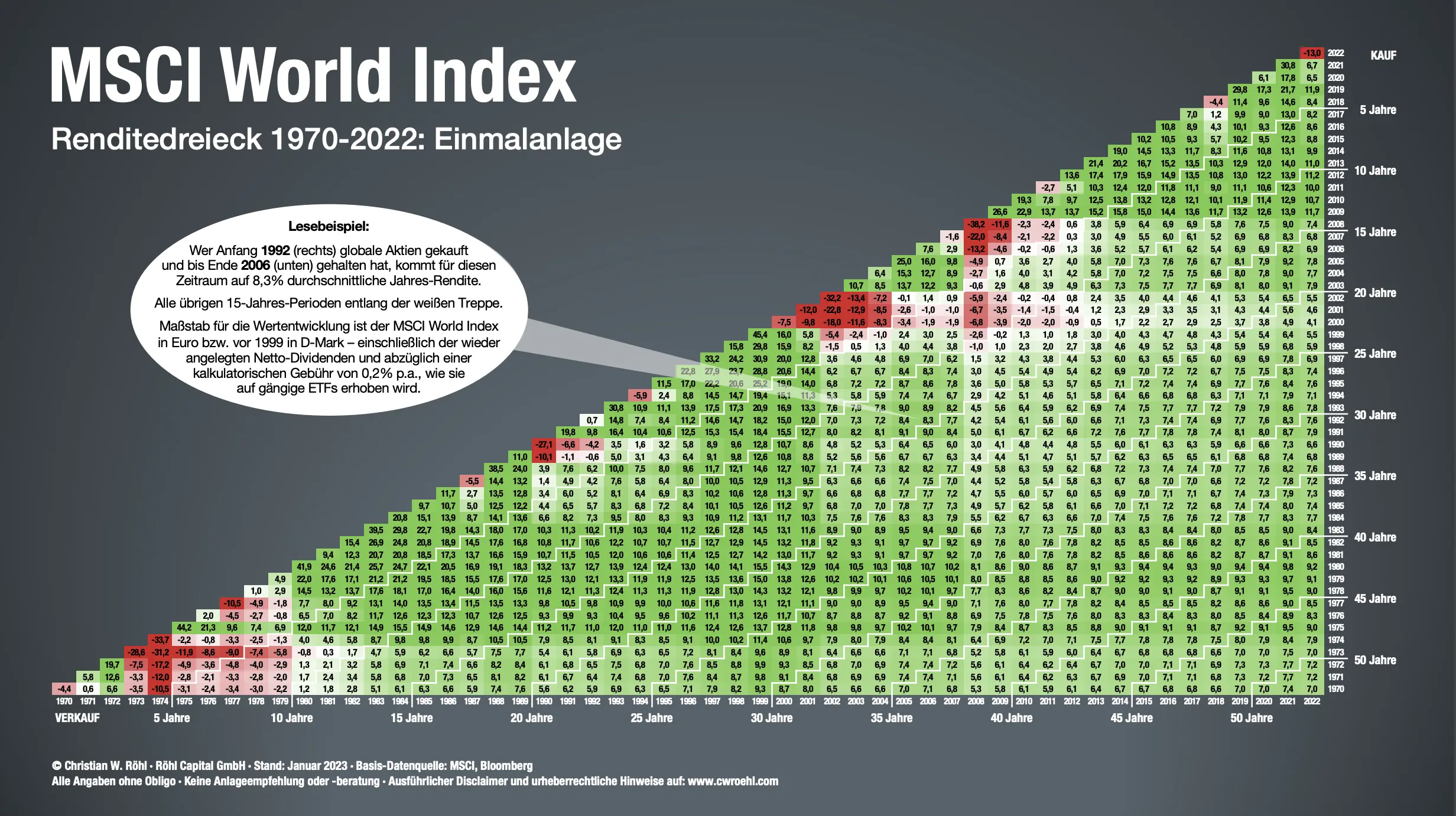 Was das Rendite-Dreieck aber auch zeigt: Wer einige Jahre dabei geblieben ist und in diesen Phasen vielleicht sogar kontinuierlich nachgekauft hat, zum Beispiel mit einem monatlichen Sparplan von 50 Euro, wurde mit sehr hohen Renditen belohnt.
