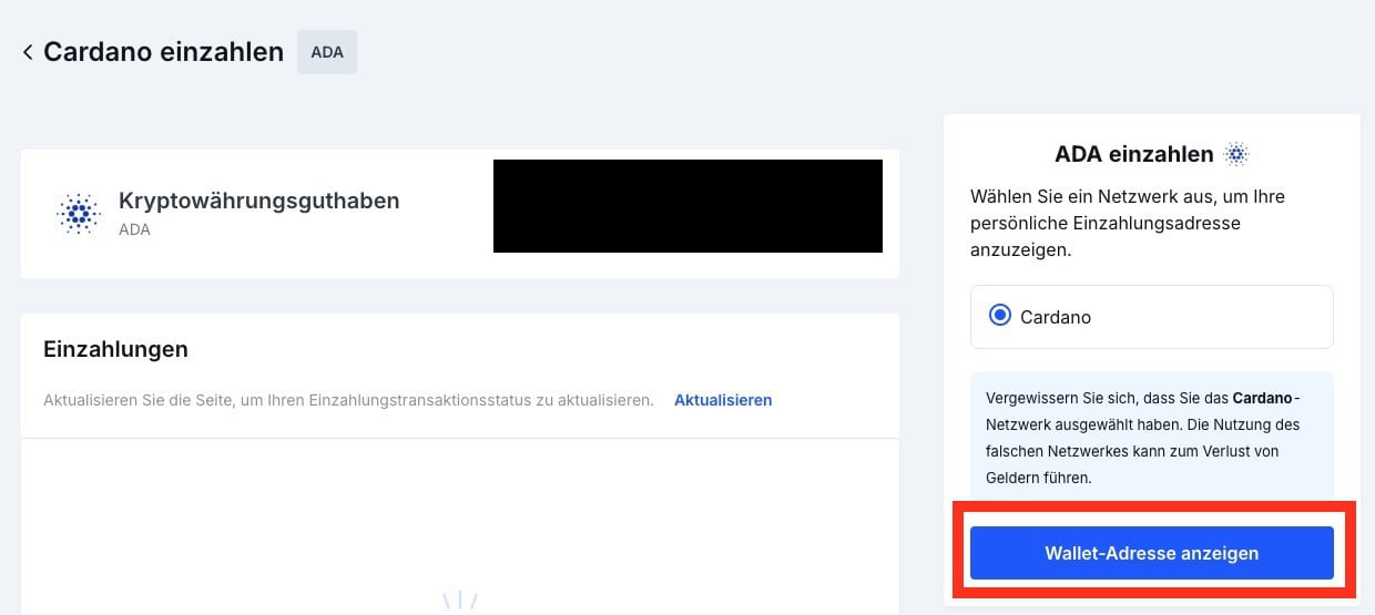 Wenn wir zum Beispiel Cardano auf unsere Bitvavo Wallet einzahlen wollen, wählen wir zunächst die jeweilige Kryptowährung aus und wählen dann den Menüpunkt “Einzahlungen”.