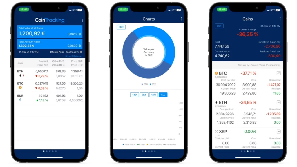 CoinTracking ist eine Software, die deine Krypto-Transaktionen aufzeichnet und daraus einen rechtlich sauberen Steuerbericht für deine Steuererklärung erstellt. So siehst du nicht nur den aktuellen Wert deiner Coins sowie Gewinne und Verluste auf einen Blick, sondern bekommst auch eine Bilanz, wie sich dein Vermögen über die Zeit entwickelt hat. Sehr nützlich für den eigenen Überblick, aber vor allem für die Steuererklärung.