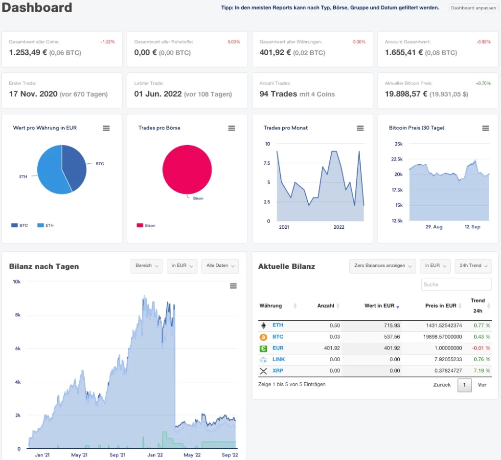 Nachdem alle Transaktionen importiert wurden, können wir unser Krypto Portfolio anschließend über den Menüpunkt “Dashboard” analysieren. Hier bekommst du eine aktuelle Bilanz über Anzahl und den Wert deiner Kryptowährungen. Auch den Anteil der einzelnen Positionen am Gesamtportfolio können wir uns grafisch aufbereitet anzeigen lassen.