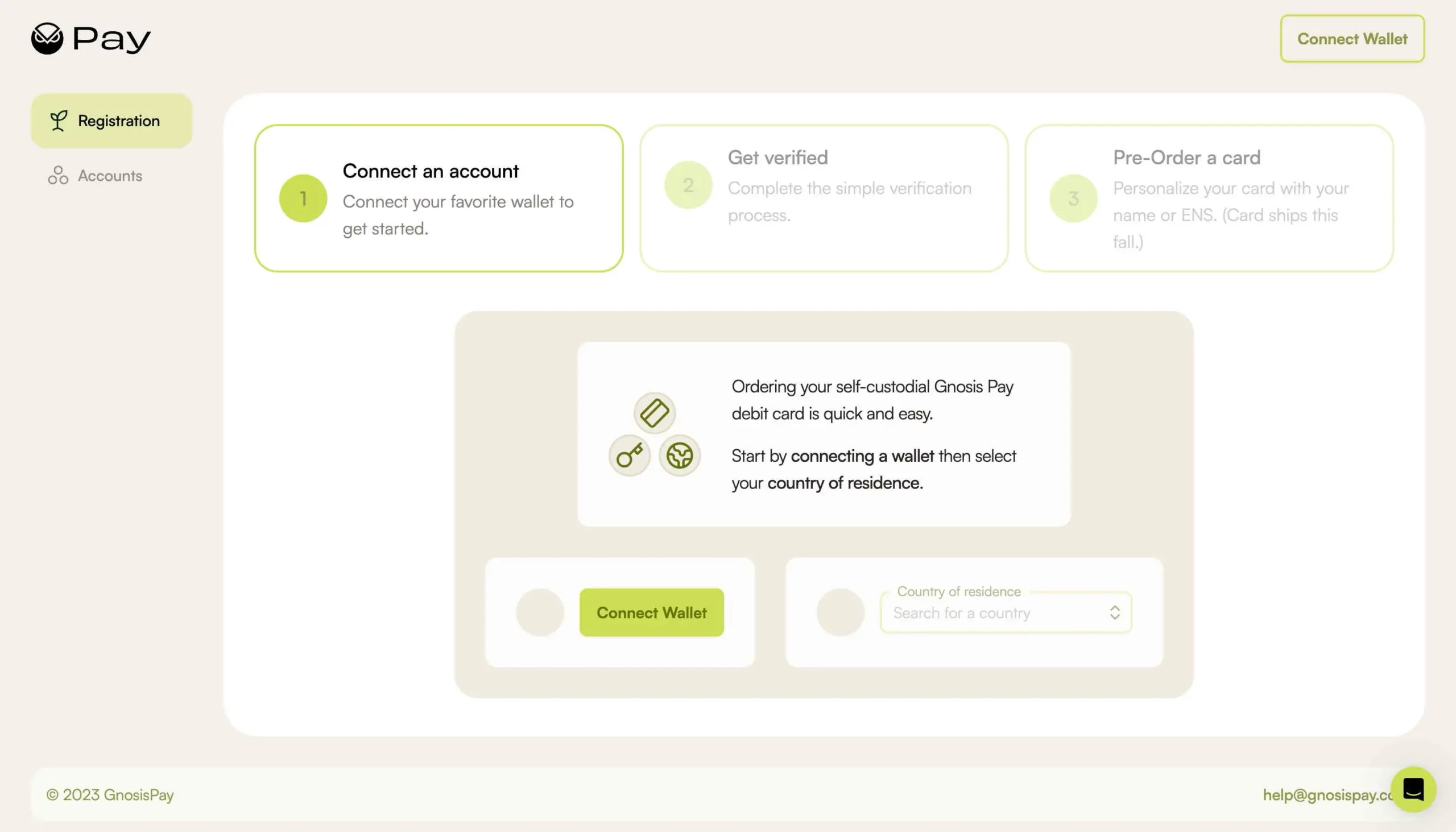 Schritt 1: Melde dich bei Gnosis Pay* an und verbinde deine Krypto Wallet mit Gnosis Pay. Die Krypto Wallet die du hier nutzt ist auch der Besitzer des Gnosis Pay Accounts. Die Wallet kann später jederzeit geändert werden. Das Wallet, das Sie zur Anmeldung verwenden, ist zudem auch das Wallet, das den Gnosis Pay Safe Wallet steuert, von dem die Abbuchungen erfolgen.