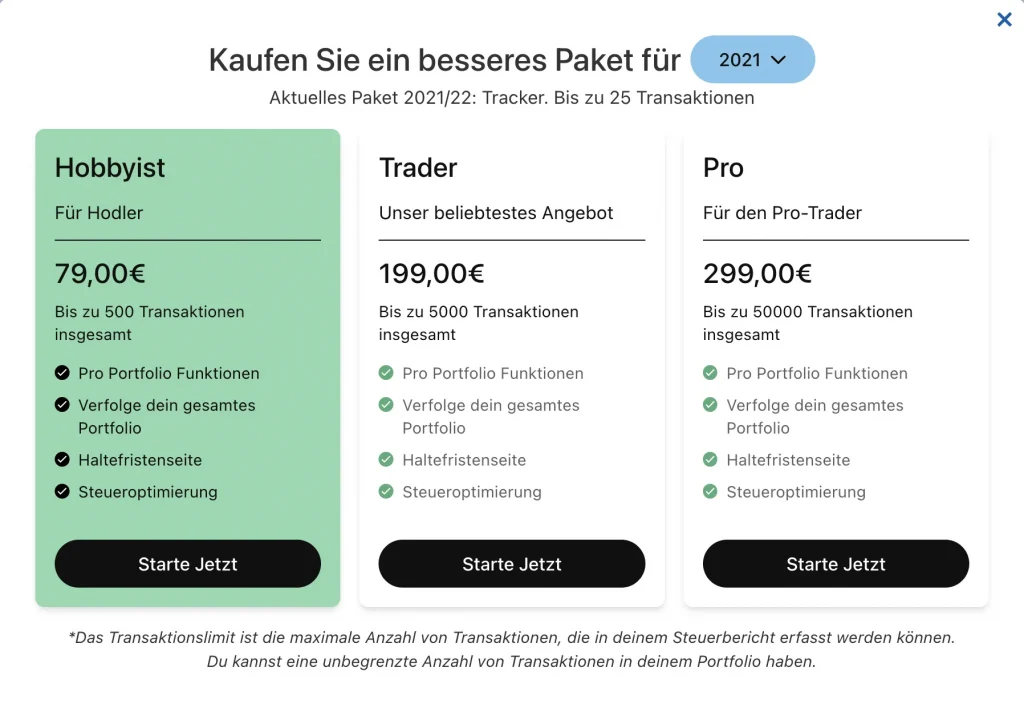Die Basisvariante von Accointing mit einem Steuerreport von bis zu 25 Transaktionen ist kostenlos. Danach muss eine Steuerpaket gekauft werden, dass bei 49 € startet. Mit unserem Accointing Rabattcode „Talerbox“ bekommst du 20 % auf alle Steuerpakete.