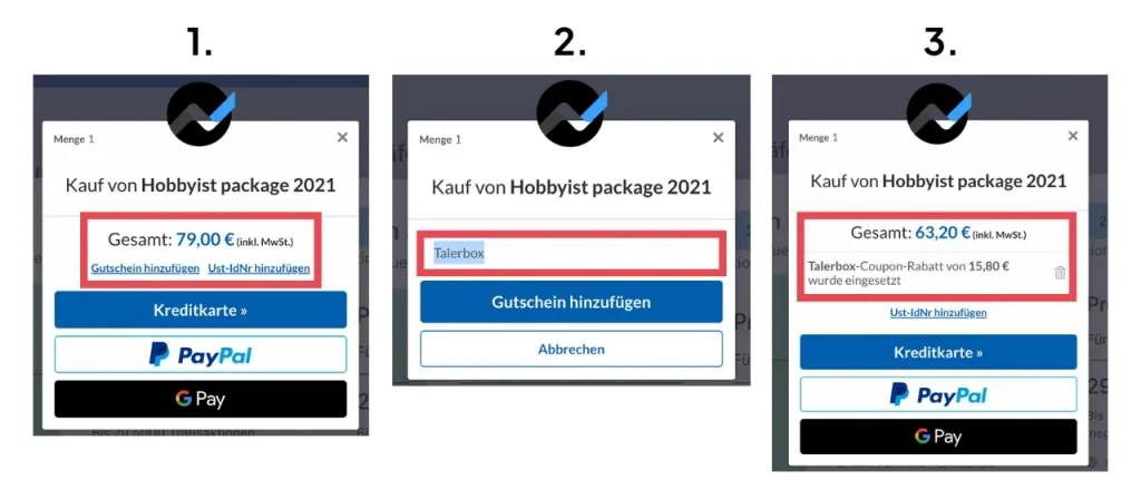 “Talerbox” an. Der Kaufpreis reduziert sich anschließend um 20% Rabatt.
