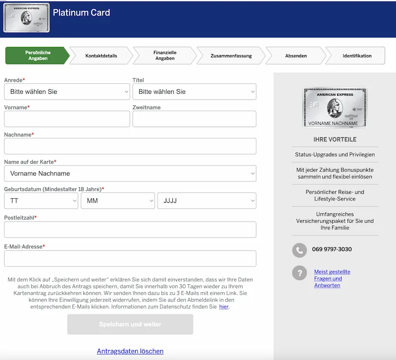 Schritt 1: Melde dich zunächst über unseren American Express* Link an. Ein Empfehlungscode ist für für den Bonus nicht notwendig. Über den Link erhältst du 2000 Extra Punkte (Wert 20€) für die Anmeldung. Die Punkte werden 4-6 Wochen nach Ausstellung der Karte ausgezahlt.