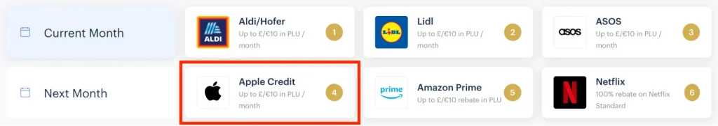 Schritt 2: Wähle im nächsten Schritt den Apple Credit Perk in deinem Plutus Account aus, um den Cashback-Booster zusätzlich zum normalen Cashback zu erhalten. Mit dem Apple Credit „Perk“ erhältst du bis zu 10 € Rabatt pro Monat auf alle iTunes Zahlungen, inklusive Apple Music.