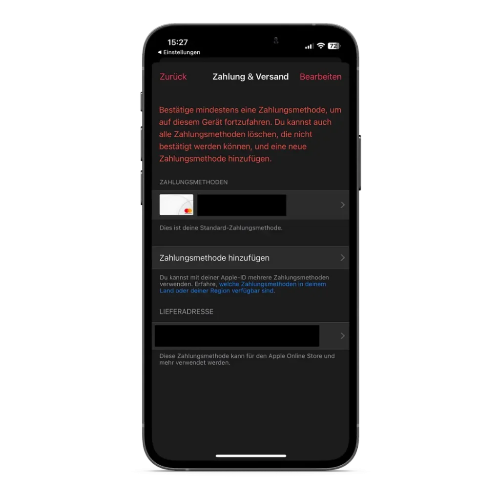 Schritt 3: Ändere nun in deinem Apple Account unter „Zahlung & Versand“ die Zahlungsart auf die Plutus Karte. Alternativ kannst du die Plutus Karte auch in Paypal hinterlegen und als Zahlungsmethode Paypal auswählen, denn die Plutus Karte ist eine normale VISA Karte und funktioniert genau wie die VISA oder Mastercards, die du von deiner Hausbank kennst. Das Cashback wird auch mit Zahlungen über Paypal vergütet.