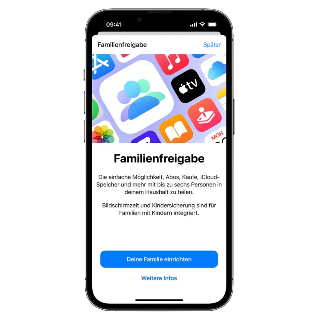 Über die Familienfreigabe kann das Apple TV+ Abo mit bis zu sechs weiteren Familienmitgliedern geteilt werden. Auf diese Weise nutzt die ganze Familie das Abo gemeinsam, ohne zusätzliche Kosten. Die Einrichtung der Familienfreigabe erfolgt über den entsprechenden Menüpunkt in deiner Apple-ID.