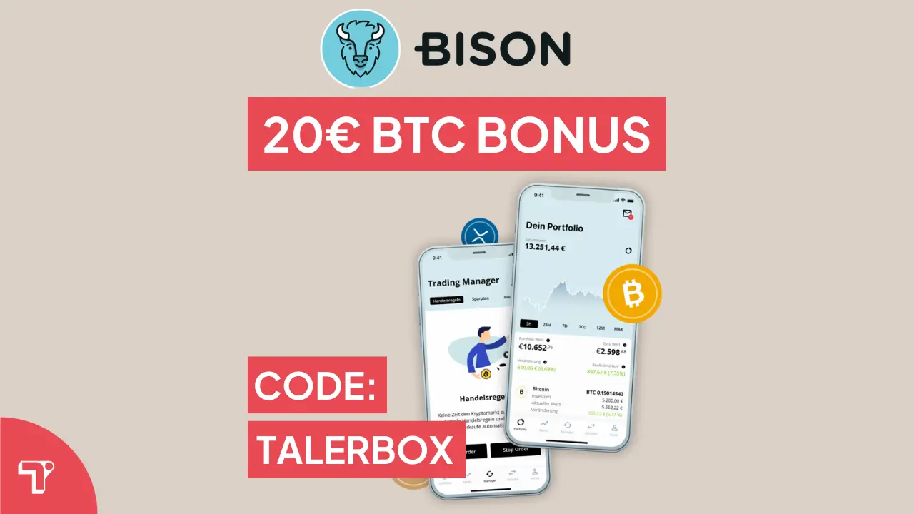 Mit dem Aktionscode “Talerbox” kannst du dir 20 € in Ethereum bei der Anmeldung und Registrierung in der Bison App sichern. Nutze dazu einfach unseren Bison Link.