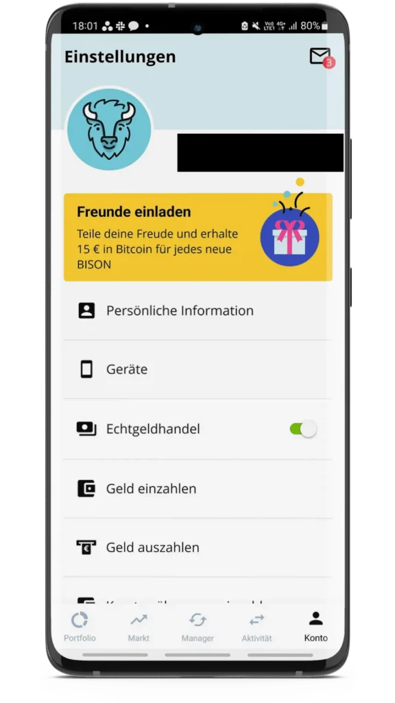 So funktioniert es: Um Freunde einzuladen, kannst du unter „Konto“ einfach deinen persönlichen Einladungscode oder Einladungslink generieren und an deine Freunde senden. Sollte ein Freund die Einladung annehmen und Bison nutzen, erhältst du 10 € in Ethereum. Ein Limit gibt es derzeit nicht!