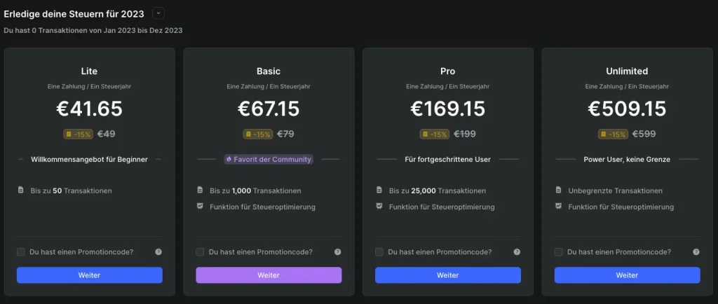 Blockpit bietet verschiedene Preispläne an, je nachdem, wie viele Transaktionen für die Steuererklärung verarbeitet werden müssen. Die Preisspanne liegt zwischen 49 € und 599 €. Die Zahlung wird jedoch erst fällig, wenn ein Steuerbericht erstellt werden muss. Bis zur Erstellung des Steuerreports kann Blockpit unverbindlich und kostenlos getestet werden. 15% Rabatt auf die Blockpit Lizenz gibt es über unseren Talerbox Promo Code Link*.