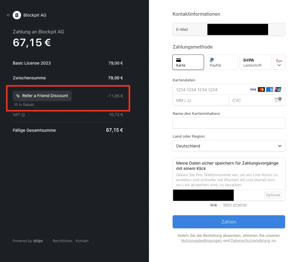 Schritt 3: Der 15% Blockpit Promo Code wird während des Bezahlvorgangs automatisch berücksichtigt. Sollte der Rabattcode wider Erwarten nicht berücksichtigt werden, kontaktiere bitte den Blockpit Support unter Angabe des Promo Codes “6yIGjW111Ov” oder den Link aus diesem Artikel und bitte um manuelle Aktivierung.