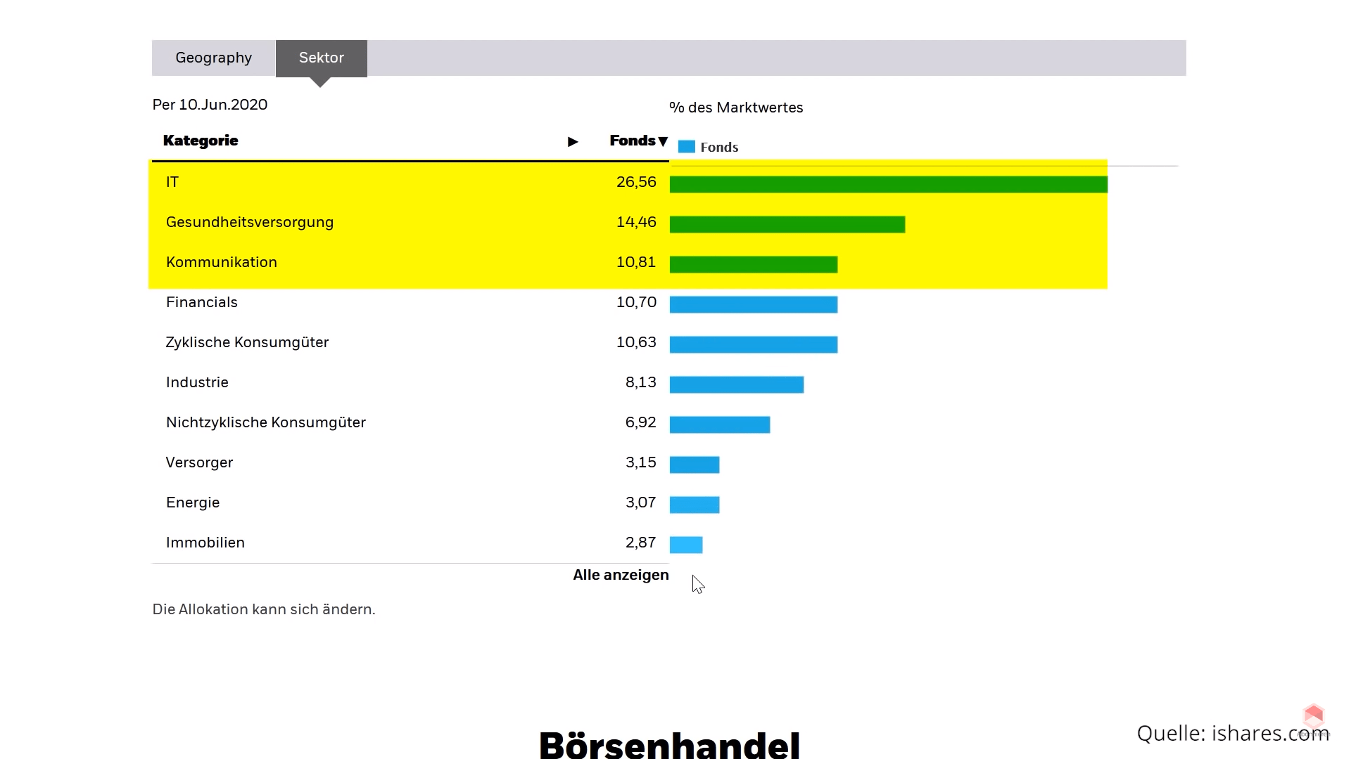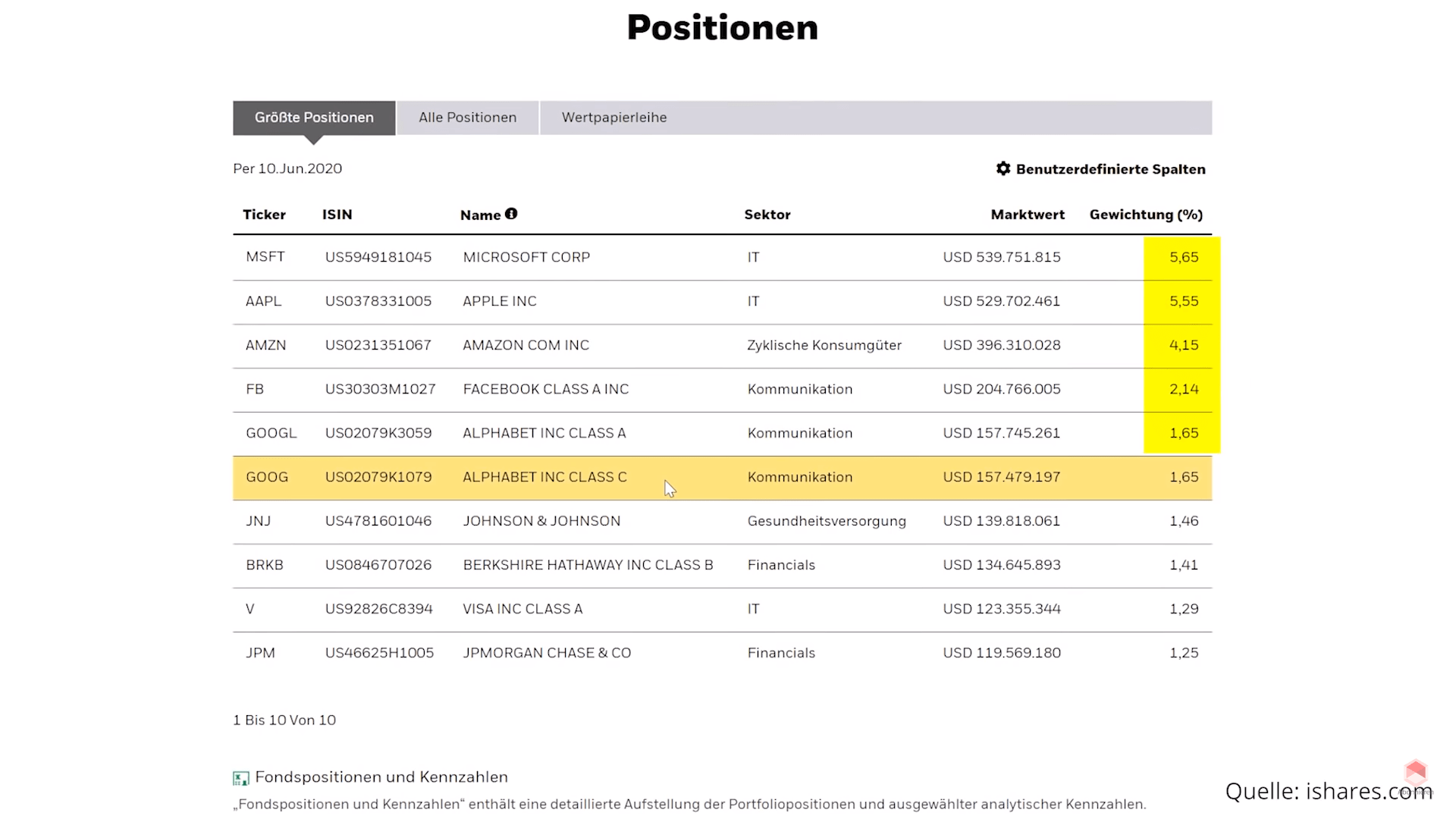 Die Treiber dieser Kurssteigerung lassen sich schnell ausmachen, wenn wir uns die Zusammensetzung der Top Positionen im Factsheet näher anschauen. Die fünf Tech-Giganten Microsoft, Apple, Amazon, Facebook und Alphabet sind mit knapp 20 %, also einem Fünftel des gesamten Index gewichtet.