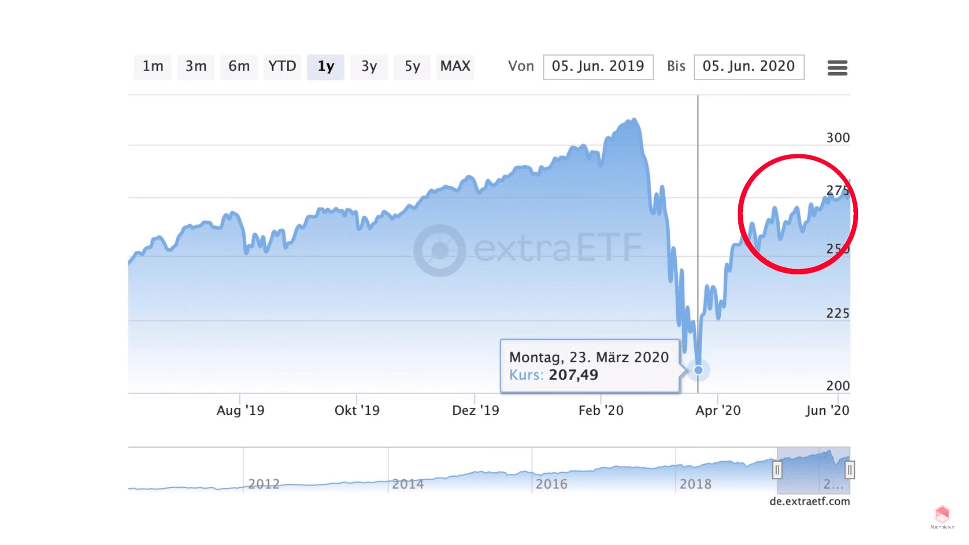 Wieso schreiben dann viele Anleger-Depots wieder grüne Zahlen, wenn die Wirtschaft doch so hart getroffen wurde? Folgt nach der kurzen Erholung der erneute Börsencrash 2020 mit 50 % und mehr Kursverlusten? Schauen wir uns dazu den S&P 500 anhand des iShares Core S&P 500 an. Seit dem bisher markierten Tiefstand diesen Jahres am 23. März hat der ETF zwei Monate später, also am 23. Mai schon wieder über 30 % Kurssteigerung hingelegt.