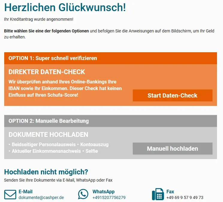 Sollte das Hochladen aus irgendeinem Grund nicht funktionieren, kannst du alternativ auch E-Mail, WhatsApp oder Fax nutzen. Als Letztes musst du den Kredit nochmals mit deiner Mobilfunknummer online signieren. Gib deshalb unbedingt deine echten Daten beim Kreditantrag an.