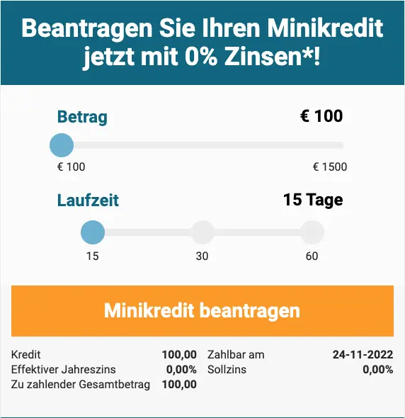 - Minikredit zwischen 100 und 1.500 € und einer Laufzeit von 15 bis 60 Tagen
