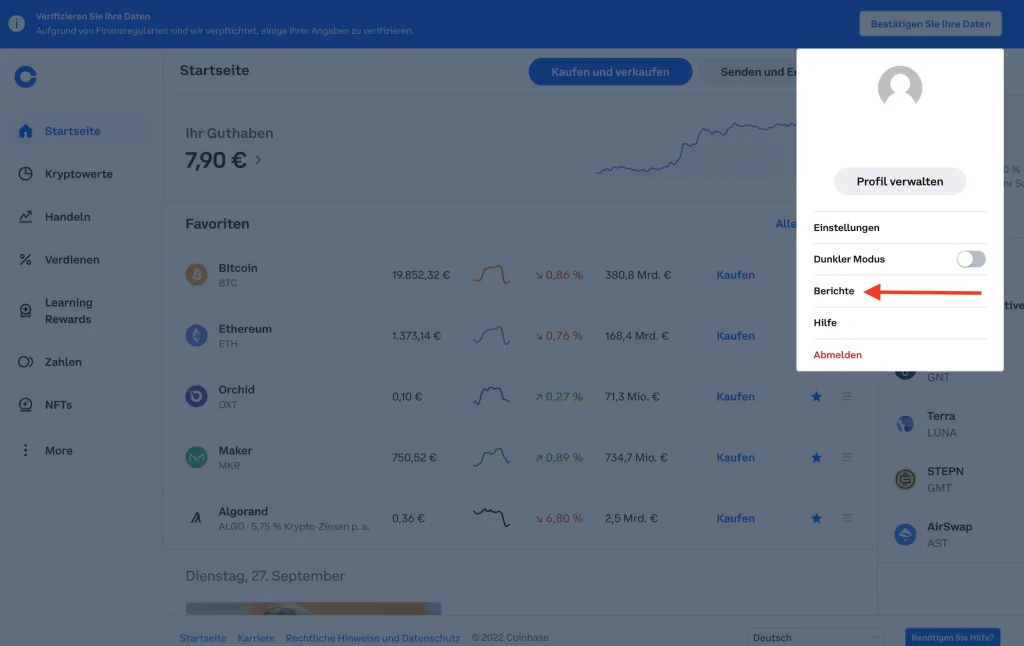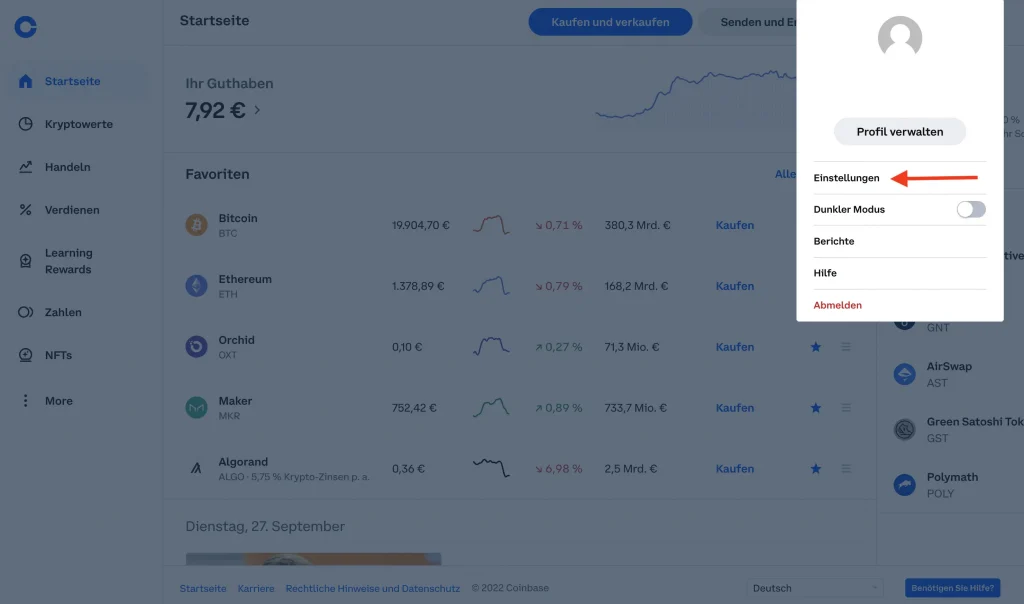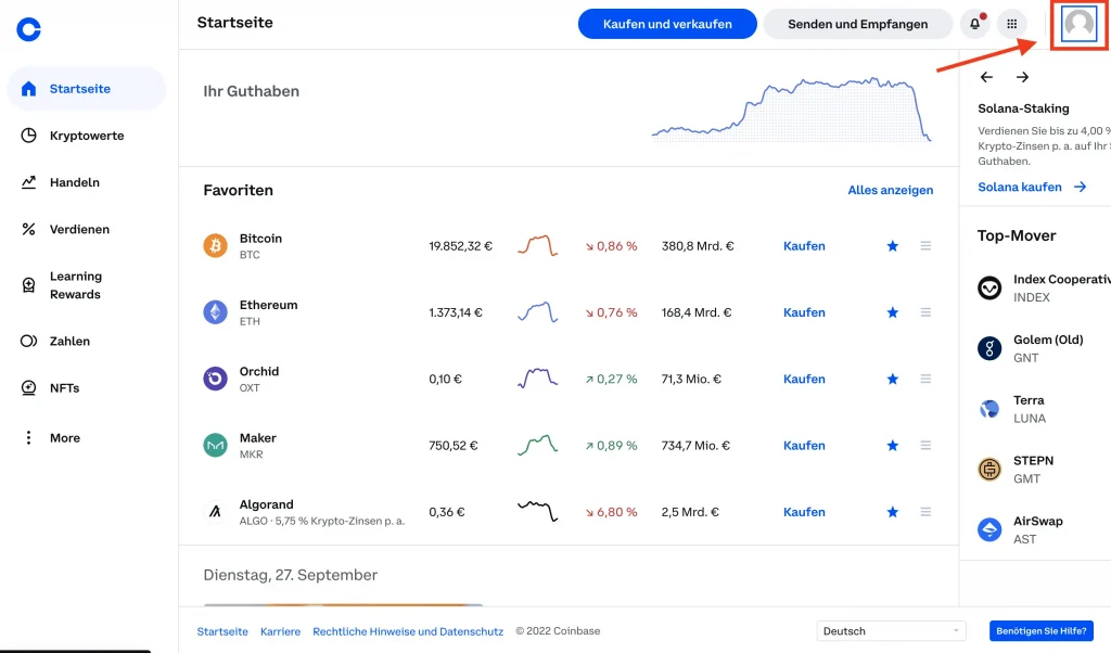 Schritt 1: Melde dich in deinem Coinbase Account an und klicke zunächst auf dein Coinbase Profil.