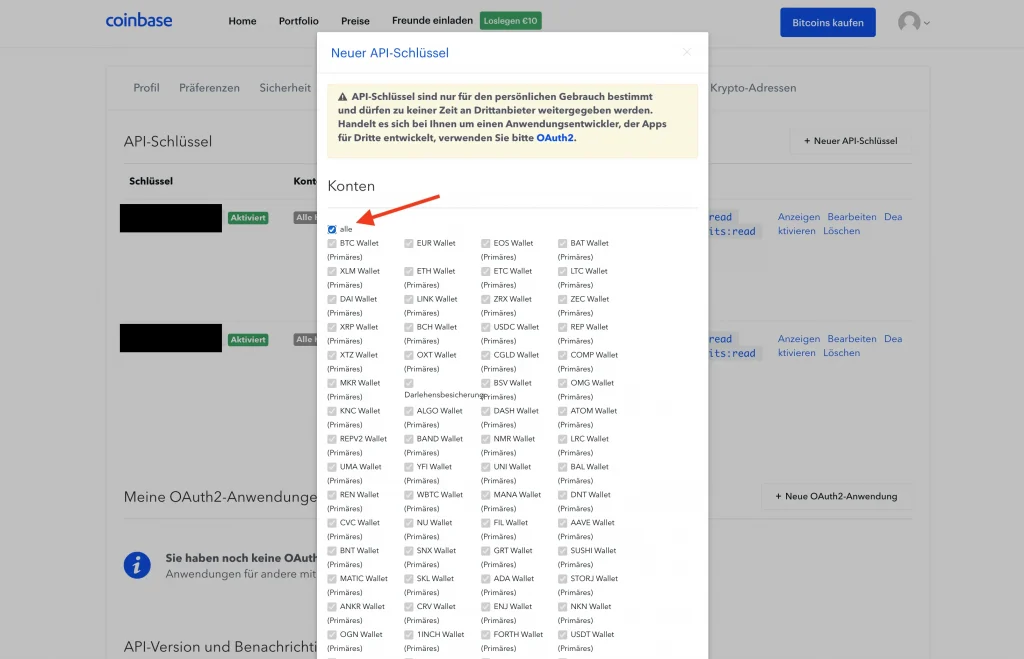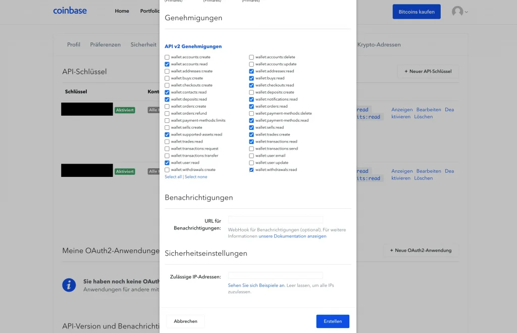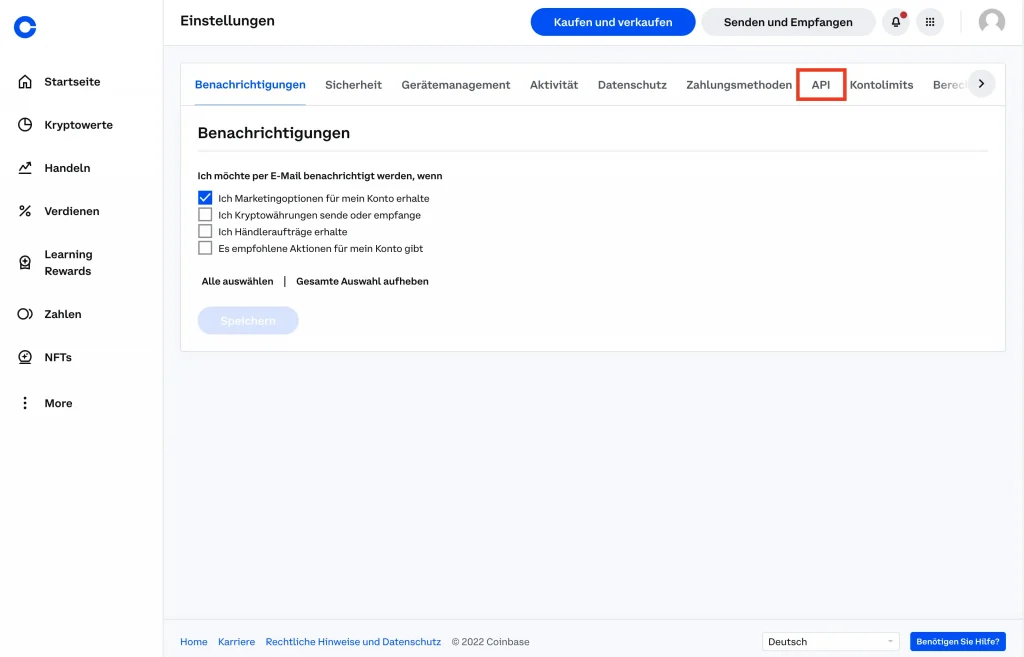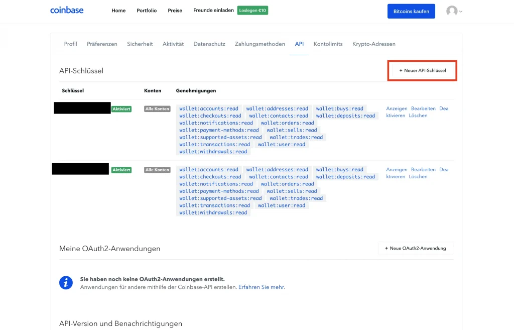 Solltest du dennoch einen API Schlüssel für Coinbase erstellen müssen, gehe wie folgt vor: