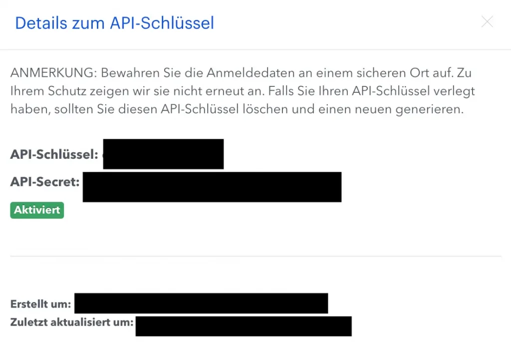 Schritt 7: Nach dem Erstellen des API-Schlüssel werden dir der API-Schlüssel und das API-Secret angezeigt, die in das Steuer Tool übertragen werden können.