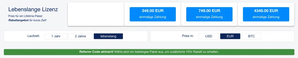 Die Zahlung kann bei CoinTracking per PayPal, Kryptowährungen, Kreditkarte oder Google Pay erfolgen. Über die lebenslange Lizenz lässt sich zudem das monatliche Abo umgehen und du kannst ein paar Euro im Vergleich zum Monatsabo sparen.