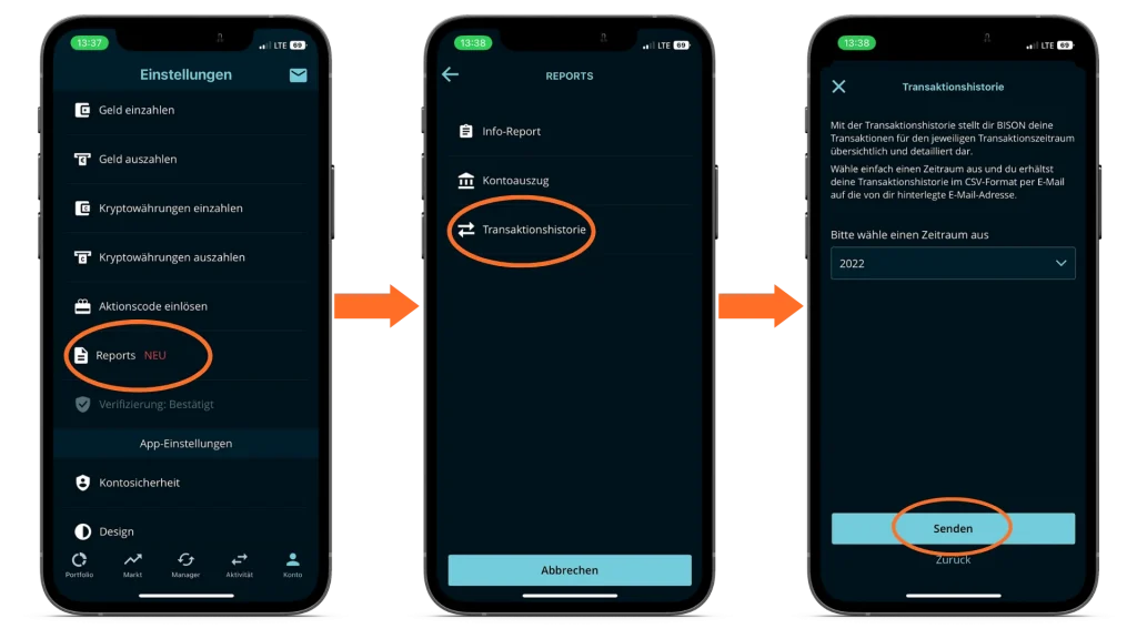 Schritt 1 – CSV-Datei bei Bison exportieren: Gehe in der Bison-App auf “Konto > Reports > Transaktionshistorie > Zeitraum > Senden”. Du bekommst anschließend die CSV Datei mit allen Transaktionen von Bison an deine hinterlegte E-Mail gesendet.