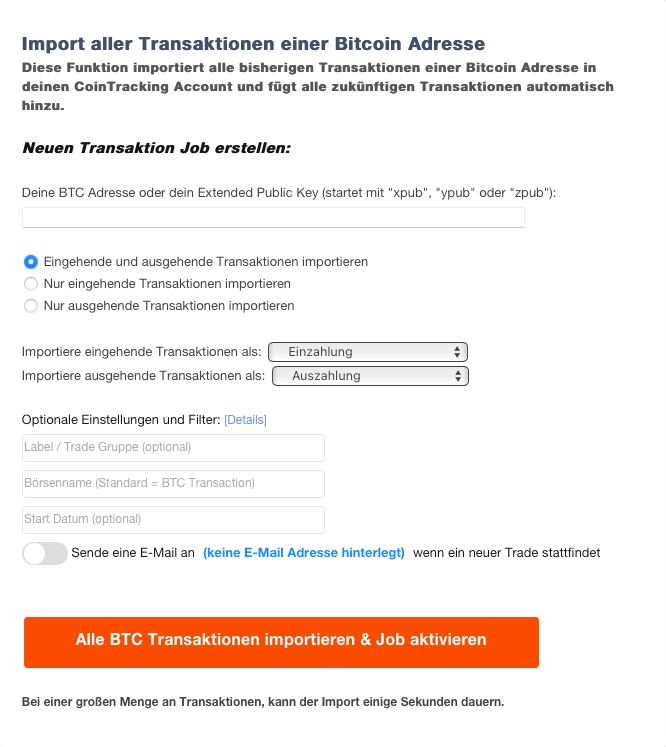 Schritt 2: Anschließend kopierst du deine Bitcoin Adresse und fügst sie in das vorgesehene Feld in CoinTracking ein. Optional können zusätzliche Filter für den Import eingestellt werden.