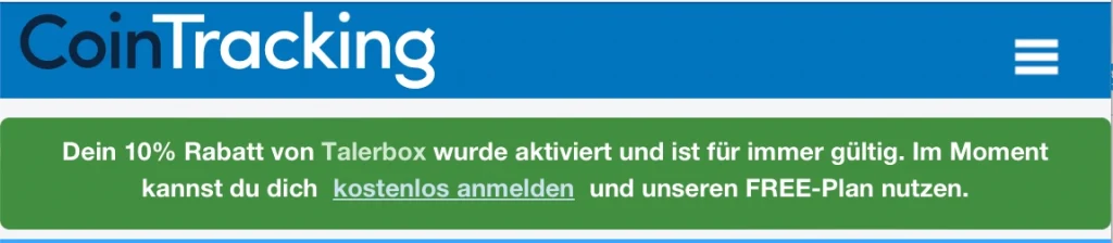 Bonus: 10 % Lifetime-Rabatt auf alle CoinTracking-Pakete über den Talerbox-Link (auch für Bestandskunden). Bei Zahlung in Bitcoin kannst du zusätzlich 5% sparen.