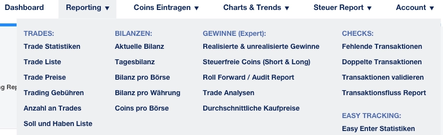 Über den Reiter “Reporting” findest du eine Übersicht über die zahlreichen Statistiken und Analysen, die Cointracking für dich bereitstellen kann.