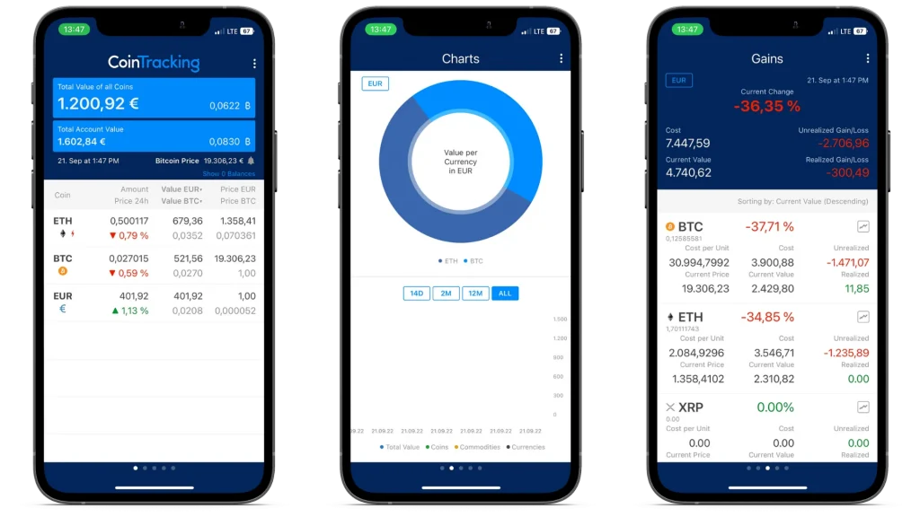 CoinTracking ist eine Software, die deine Krypto-Transaktionen aufzeichnet und daraus einen rechtlich sauberen Steuerbericht für deine Steuererklärung erstellt. So siehst du nicht nur den aktuellen Wert deiner Coins sowie Gewinne und Verluste auf einen Blick, sondern bekommst auch eine Bilanz, wie sich dein Vermögen über die Zeit entwickelt hat. Sehr nützlich für den eigenen Überblick, aber vor allem für die Steuererklärung.