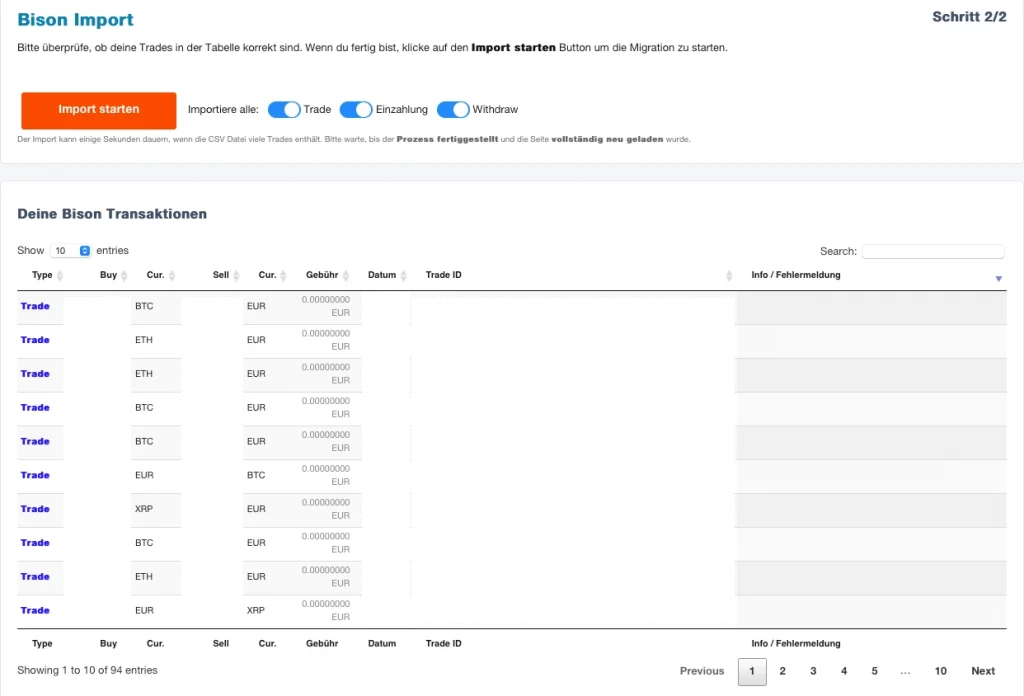 Schritt 5: Nun kannst du den Import der Transaktionen starten. Sind alle Transaktionen importiert, können sie anschließend im CoinTracking Dashboard eingesehen oder weitere Börsen importiert werden.