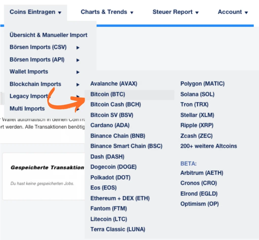 Schritt 1: Wenn du alle vergangenen und zukünftigen Transaktionen einer Bitcoin Wallet importieren möchtest, wähle zuerst Bitcoin aus der Liste in CoinTracking aus.