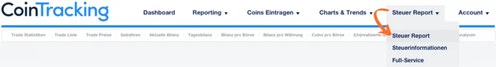 Schritt 1: Nachdem alle Börsen und Wallets mit CoinTracking synchronisiert und eventuelle fehlerhafte Transaktionen korrigiert sind, kann nun der Steuerreport bei CoinTracking erstellt werden. Anstoßen lässt sich der Steuerreport in der Menüleiste unter “Steuer Report”.