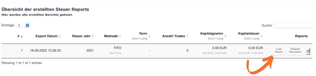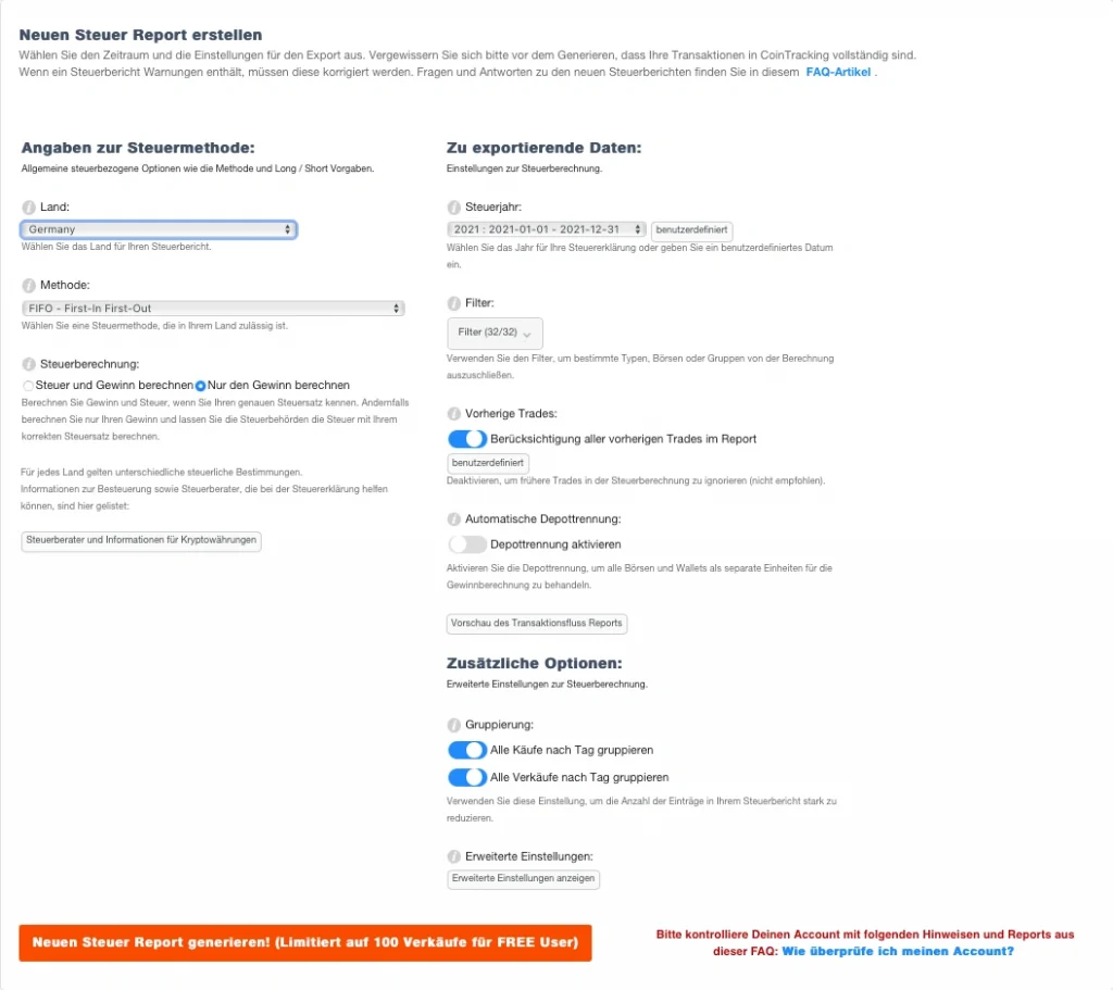 Schritt 2: Bevor der Steuerreport erstellt wird, müssen vorab die Ländereinstellungen und die Steuer- und Bewertungsmethode korrekt eingestellt werden. In Deutschland ist die Bewertungsmethode FIFO (First-In-First-Out) anzuwenden. Eine abweichende Bewertungsmethode wird von den Finanzämtern i.d.R. nicht akzeptiert. Stimmt alles, kannst du dann ein neuen Steuer Report generiert werden.