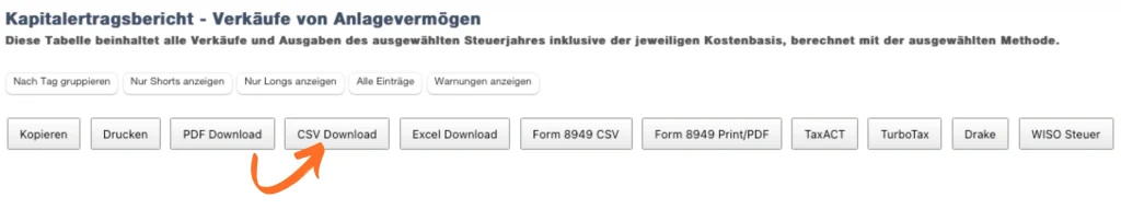 Schritt 3: Der begehrte Steuerreport kann nun als PDF- oder CSV-Datei heruntergeladen werden. Zusätzlich gibt es noch einmal eine Übersicht über die Einstellungen und gewählten Parameter des Reports. Es können beliebig viele Berichte mit unterschiedlichen Parametern erstellt werden.