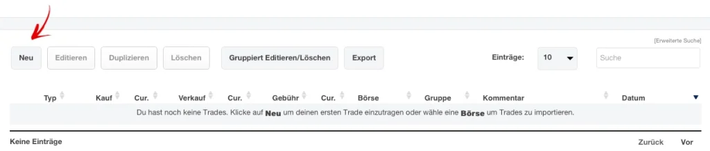 Schritt 1: Manchmal kann es notwendig sein, Transaktion händisch zu importieren. Dazu gehst du über den Reiter „Coins Eintragen“ und dann „Manueller Import“. Über den Button “Neu” können dann Transaktionen hinzugefügt werden.