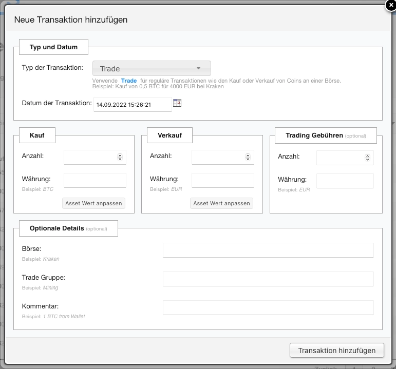 Schritt 2: In der Eingabemaske kannst du die Art der Transaktion, das Datum und alle weiteren notwendigen Informationen zur Transaktion eingeben. Mach dir keine Sorgen, wenn du dich vertippst. Wenn du dich vertippt hast, kannst du deine Transaktionen jederzeit ändern oder löschen.