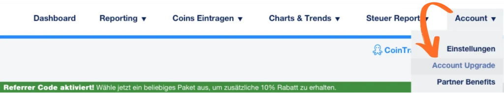 Schritt 2: Nach der Anmeldung kannst du CoinTracking zunächst kostenlos testen. Ein Steuerpaket muss erst für den Steuerreport erworben werden. Zu den Steuerpaketen gelangst du über Account -> Account Upgrade.