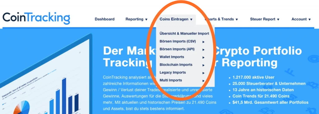 Für den Import deiner Transaktionen findest du in der Menüleiste von CoinTracking unter dem Reiter “Coins eintragen” alle möglichen Optionen. Wie du bei den einzelnen Varianten genau vorgehen musst, zeigen wir dir in den folgenden Abschnitten.