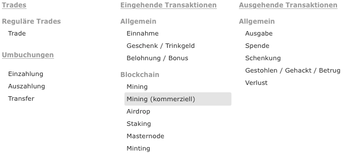 Schritt 3: CoinTracking unterstützt eine Vielzahl an verschiedenen Transaktionen. Du kannst nicht bloß einfache Käufe/Verkäufe importieren, sondern auch die Einnahmen aus Mining, Staking oder Airdrops hinterlegen.