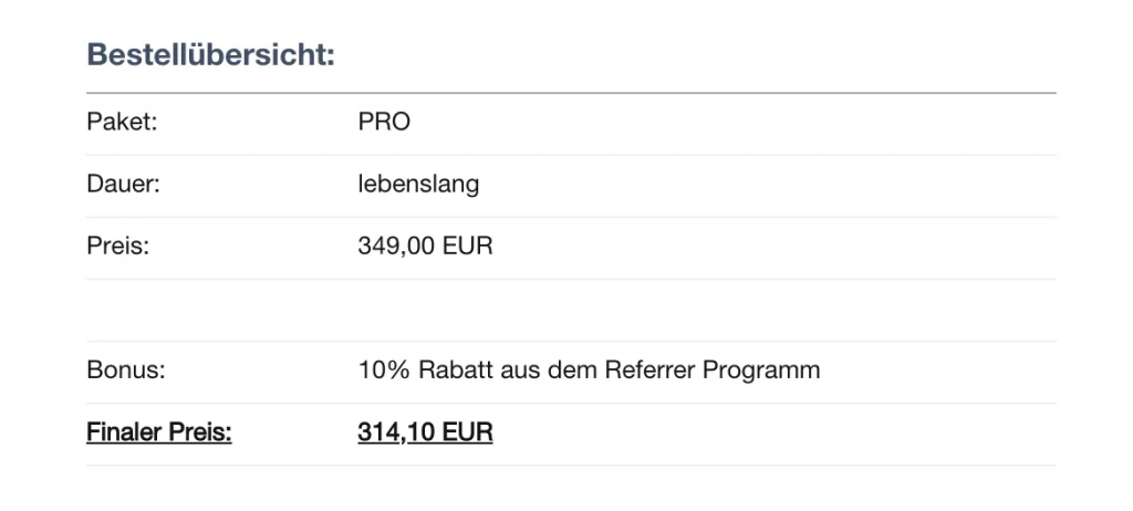 Schritt 3: Anschließend folgt die Eingabe der Rechnungsdaten und eine Bestellübersicht. Die 10% Rabatt werden automatisch berücksichtigt, wenn du dich über unseren Link angemeldet hast.