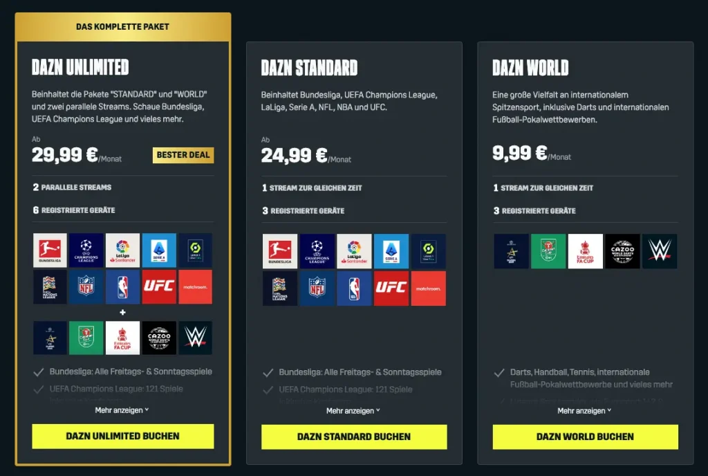 | Inhalt | Ausgewählte Sportarten (u.a. Darts, Handball, Wrestling) | Bundesliga, UEFA Champions League, LaLiga, Serie A, NFL, NBA und UFC | Vollständiges DAZN Programm |