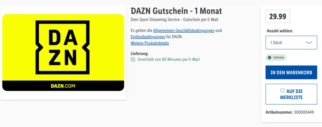Du kannst DAZN-Gutscheine auf der DAZN-Webseite oder über Partner-Websites wie Lidl oder Amazon kaufen.