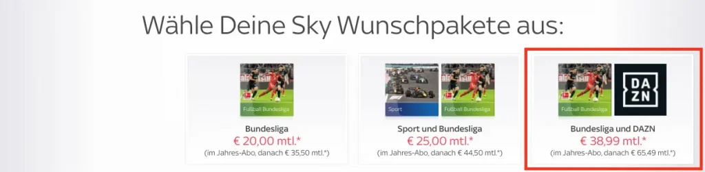 Sky bietet ein Kombi-Paket mit einem DAZN Abo an, das es ermöglicht, im ersten Jahr 10 € pro Monat zu sparen. Das Angebot kann insbesondere für Fans der Bundesliga eine Option sein, die sonst keine Möglichkeit mehr haben, alle Spiele des Spieltags zu sehen. Du zahlst dann für das zusätzliche DAZN-Abo über Sky im ersten Jahr statt 30 € pro Monat nur 20 € pro Monat. (Anteilig)