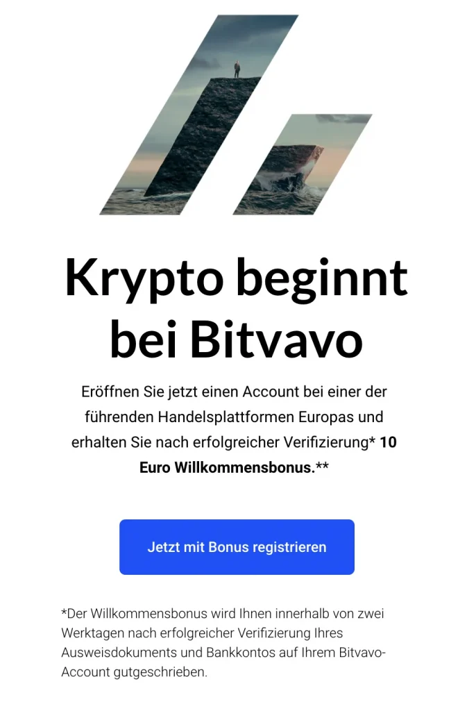 - Der Bitvavo Bonus in Höhe von 10 € wird nach erfolgreicher Anmeldung, Verifizierung und Mindesteinzahlung von min. 10 € innerhalb von 2 Werktagen gutgeschrieben.