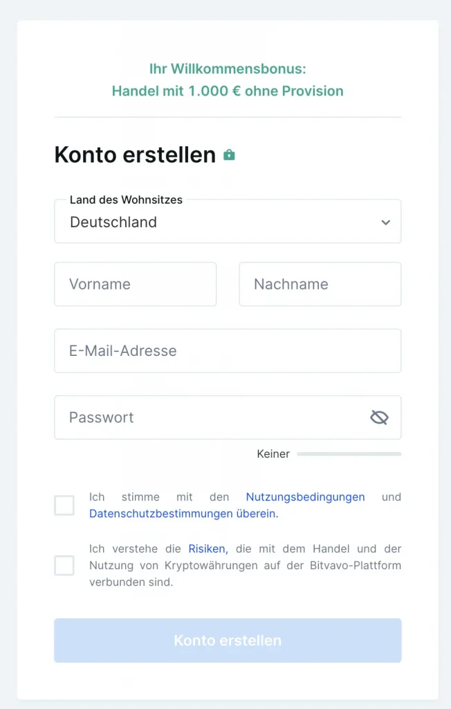 - Bitvavo Konto innerhalb von 7 Tagen nach Anmeldung vollständig verifizieren, um für den Bonus berechtigt zu sein (Verifizierung deines Ausweisdokuments und Bankkontos) und min. 10 € einzahlen.