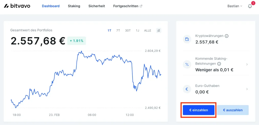Schritt 2: Geld von deinem Girokonto auf Bitvavo einzahlen oder Startbonus nutzen – Gehe in deinem Bitvavo-Konto auf “Einzahlen” und wähle “SEPA-Überweisung” oder eine der anderen Einzahlungsmöglichkeiten wie Paypal oder Sofortüberweisung, um Geld auf Bitvavo einzuzahlen.