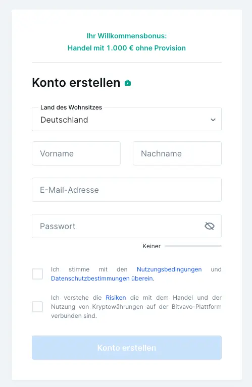 Schritt 1: Melde dich bei Bitvavo an – Gehe auf die Website von Bitvavo und klicke auf „Registrieren“. Fülle das Anmeldeformular aus und klicke auf „Konto erstellen“.