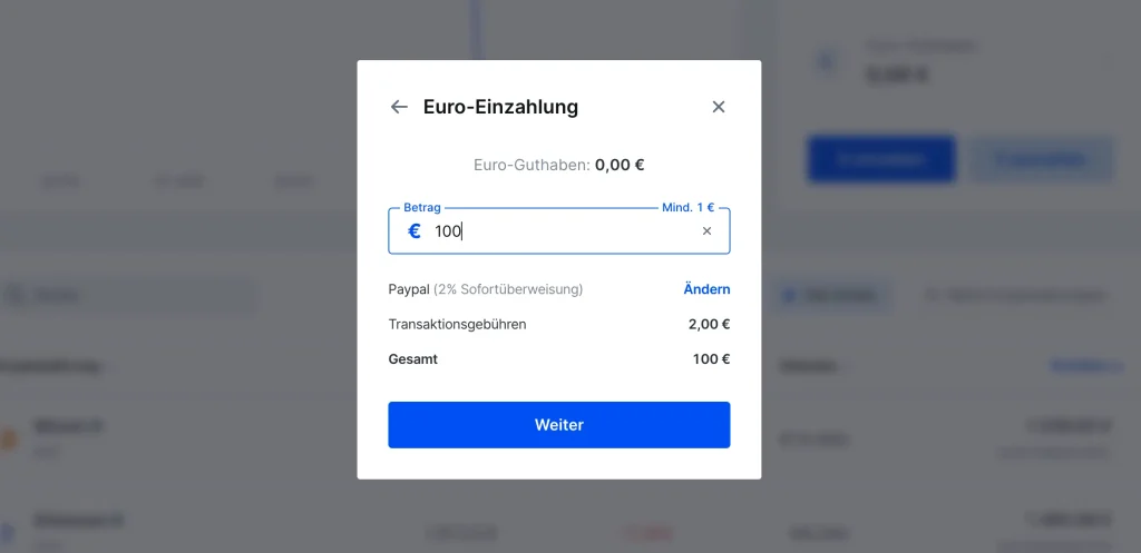 Schritt 3: Gib den Betrag ein, den du mit Paypal auf Bitvavo einzahlen möchtest und bestätige die Einzahlung. Du wirst dann zu Paypal weitergeleitet, wo du den Betrag wie gewohnt mit Paypal bezahlen kannst.