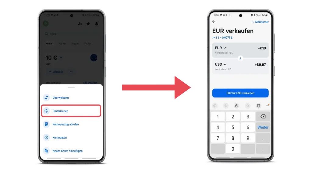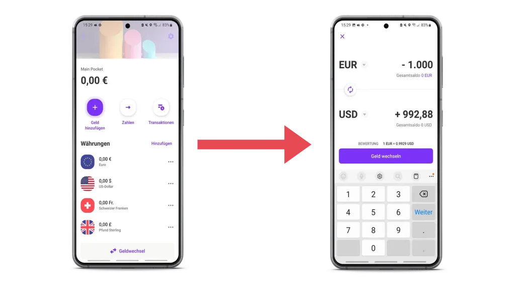 Der Tausch von Euro in Dollar bei Revolut ist ähnlich einfach wie bei Wise.