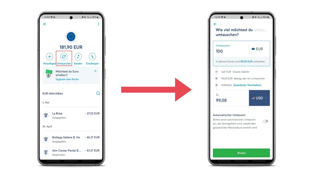 - Optional kannst du den Umtausch automatisch planen, wenn dir der Wechselkurs zu hoch erscheint. Gib dann einfach deinen gewünschten Wechselkurs ein.